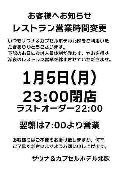 レストラン営業時間変更